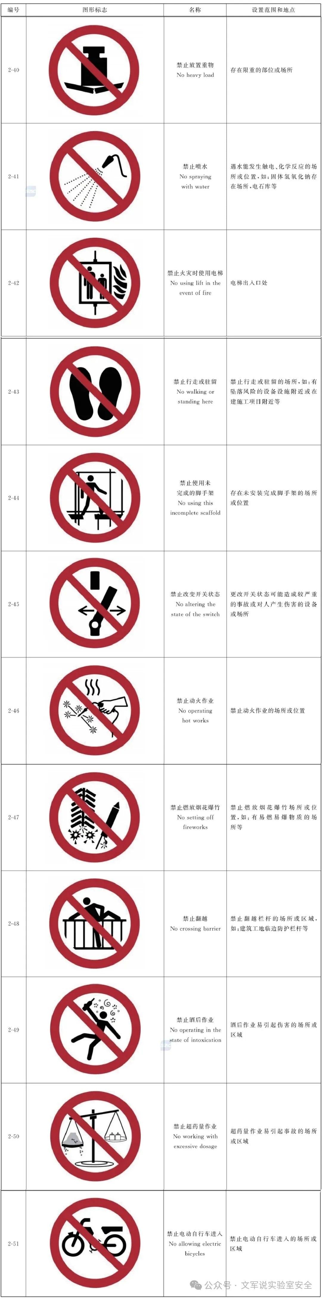 更改“当心腐蚀”“当心中毒”“当心生物危害”“当心落物”“当心吊物”“当心挤压”“当心夹手”“当心叉车和其他场(厂)内机动车辆”“禁止吸烟”“禁止用水灭火”“禁止叉车和其他场(厂)内机动车辆通行”“禁止乘人”“禁止停留”“禁止通行”“禁止攀登”“禁止倚靠”“禁止戴手套”“禁止穿带钉鞋”“禁止佩戴心脏起搏器者靠近”“禁止游泳”“禁止滑冰”“必须戴防护眼镜”“必须戴口罩”“必须戴防毒面具”“必须戴护耳器”“必须戴安全帽”“必须系安全带”“必须穿救生衣”“必须穿防护服”“必须戴防护手套”“必须穿防护鞋”“必须加锁”“应急避难场所”“击碎板面”图形标志。