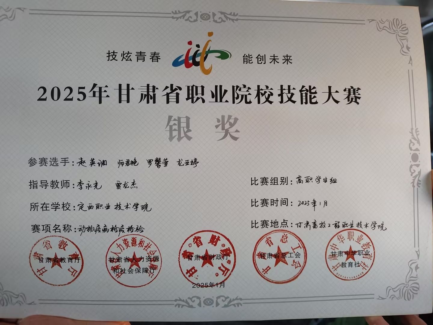 1月10日至1月13日,在2025年全省职业院校技能大赛中,betway畜牧兽医专业龙亚婷、师君艳、赵英调、罗馨萱凭借出色的专业技能和稳定的发挥,荣获全省动物疫病检疫检验赛项(高职学生组)银奖的殊荣。这一成绩的取得,不仅是对betway师生专业技能水平的肯定,更是对betway教育教学质量的有力证明。