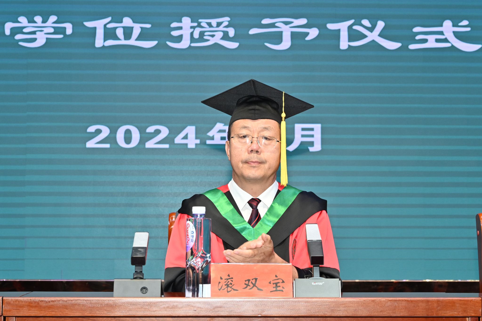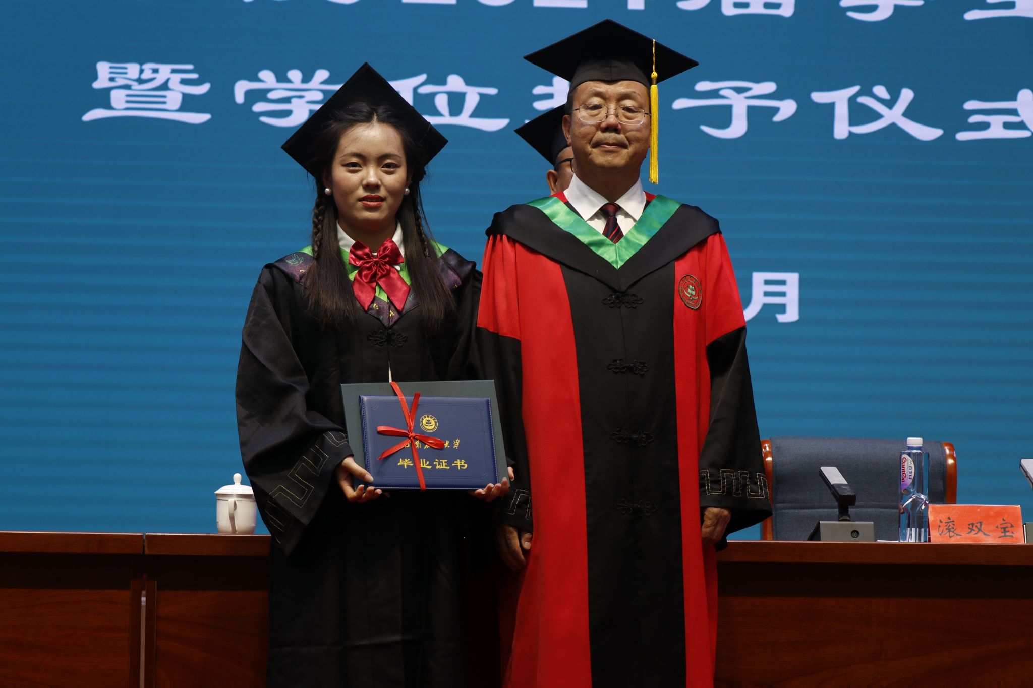 学士学位授予仪式现场,身穿学位服的毕业生满怀喜悦与激动,依次登台,与各位领导依次亲切握手,滚双宝为毕业生颁发学位证书并拨穗合影。
