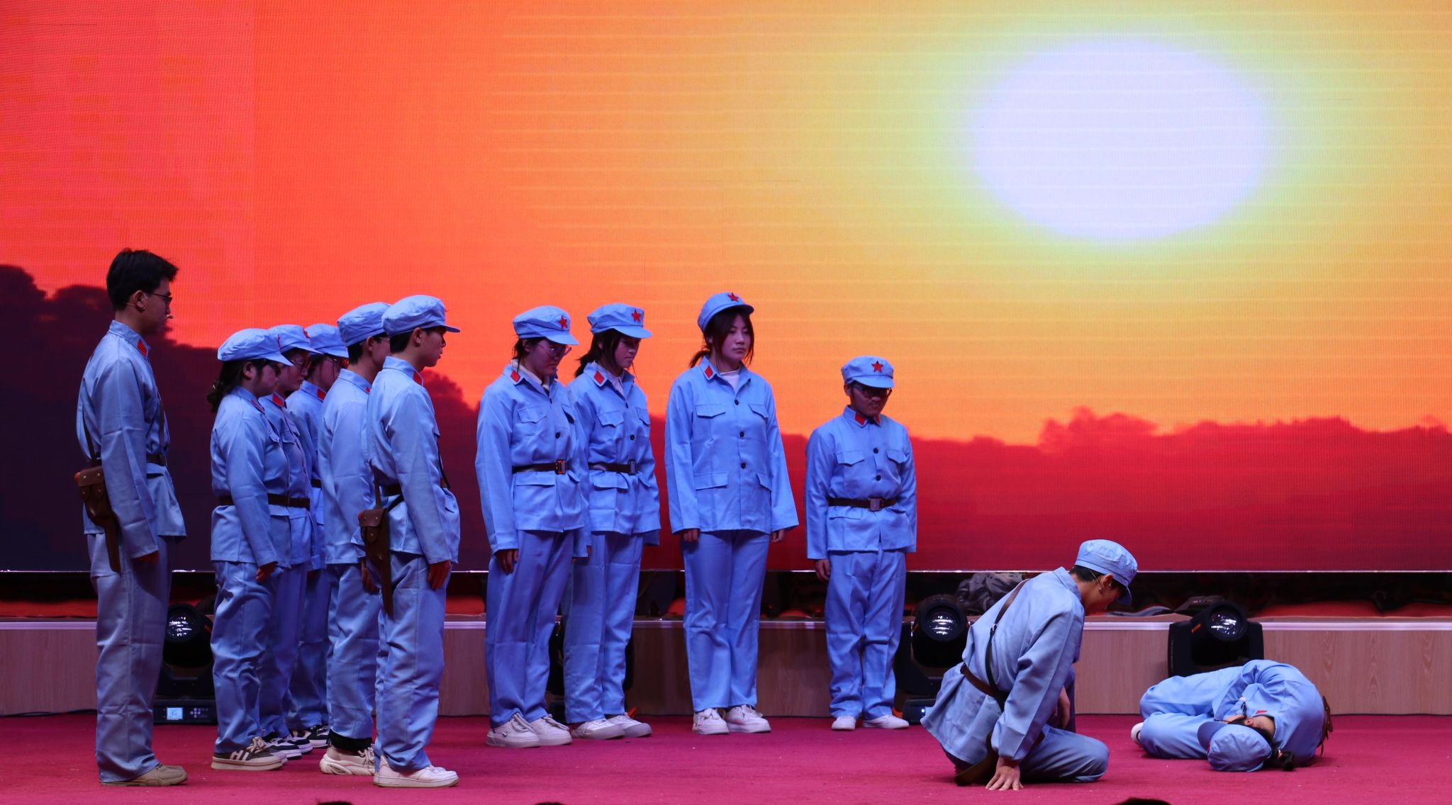自大赛启动以来,共吸引了来自全校各学院的62组参赛队伍热烈响应,近1000名同学积极参加本次比赛。经过初赛和复赛的紧张角逐,最终11个团队脱颖而出,成功晋级决赛舞台。决赛现场,灯光璀璨,气氛热烈,一幕幕爱国情景剧精彩上演,生动再现了志愿军战士气吞山河的英雄气概、刘胡兰烈士视死如归的革命气节、袁隆平院士躬耕田野的坚韧不拔、香港回归的感人瞬间、 复兴路上的青春力量、陈独秀先生救亡图存的上下求索、屠呦呦研究员探索青蒿素的执着追求……每一个场景都感人至深,每一句台词都直击心灵,深深触动了在场每一位师生的心弦。