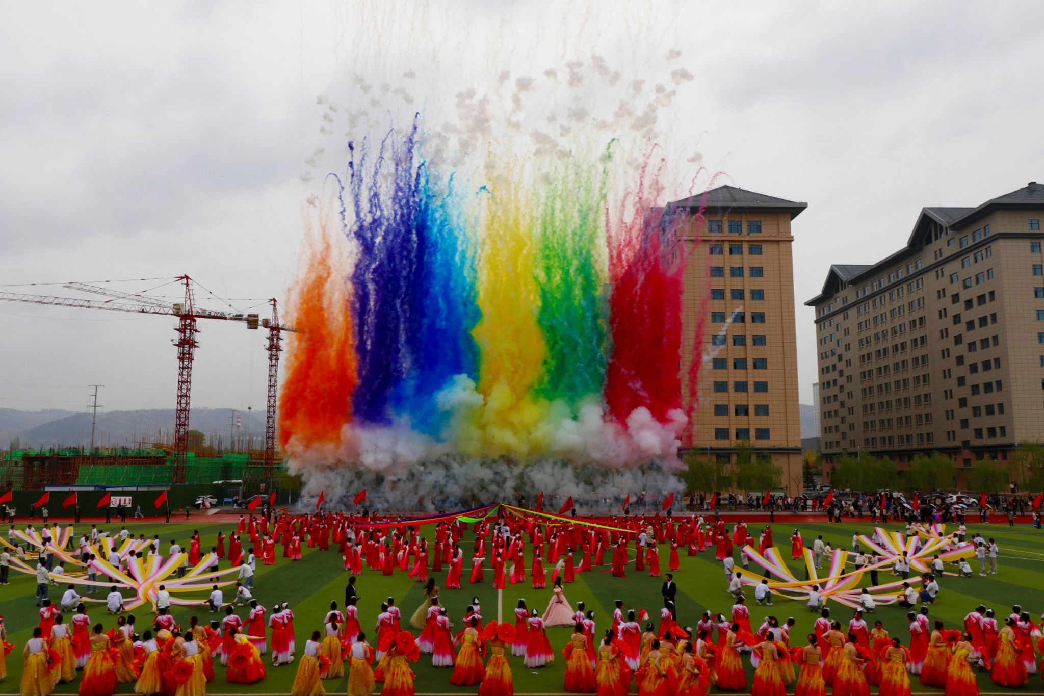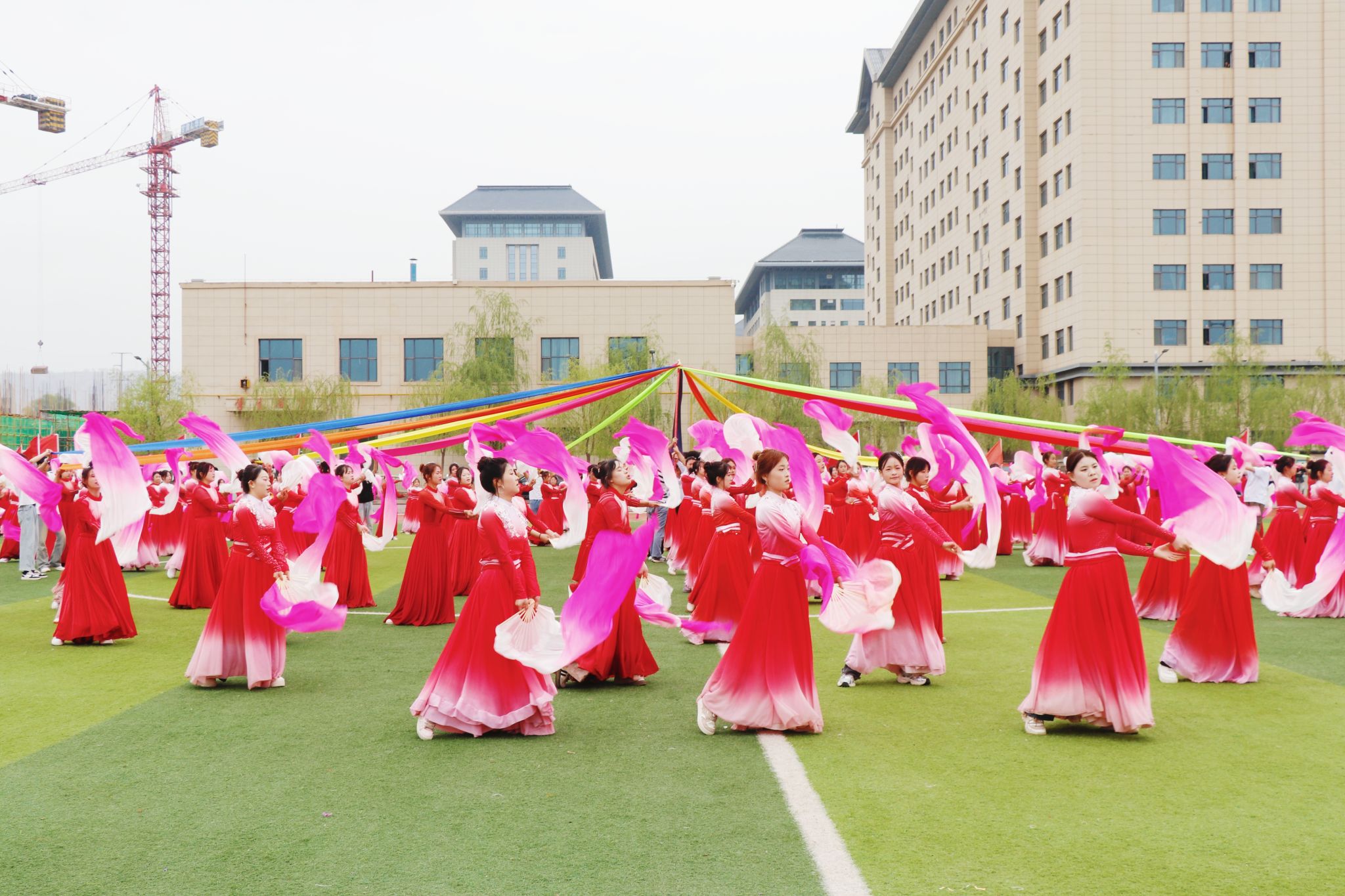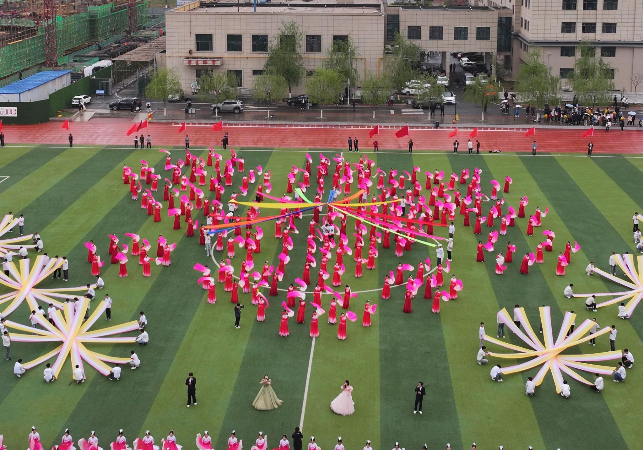 舞者红衣似火,以灵动身姿与精妙编排惊艳全场。或交错、或成环、或聚散,队形幻变间,将团队力量、蓬勃生机尽数展现。结尾处12条彩带象征着12个二级学院部,承载着彼此守望相助、团结一心的信念,烟花、火炬等队形,寄寓学院不断奋进、多元开拓的辉煌愿景。