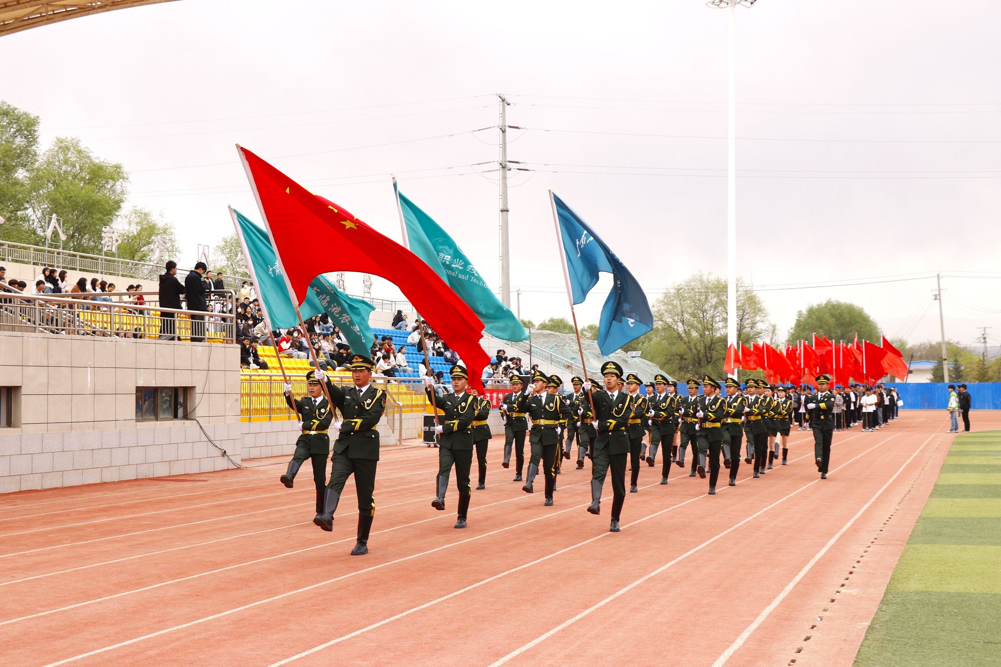 雄赳赳、气昂昂,走在最前列的是我们的国旗班。他们身着统一的制服,手持鲜艳的五星红旗,步伐矫健、英姿飒爽。