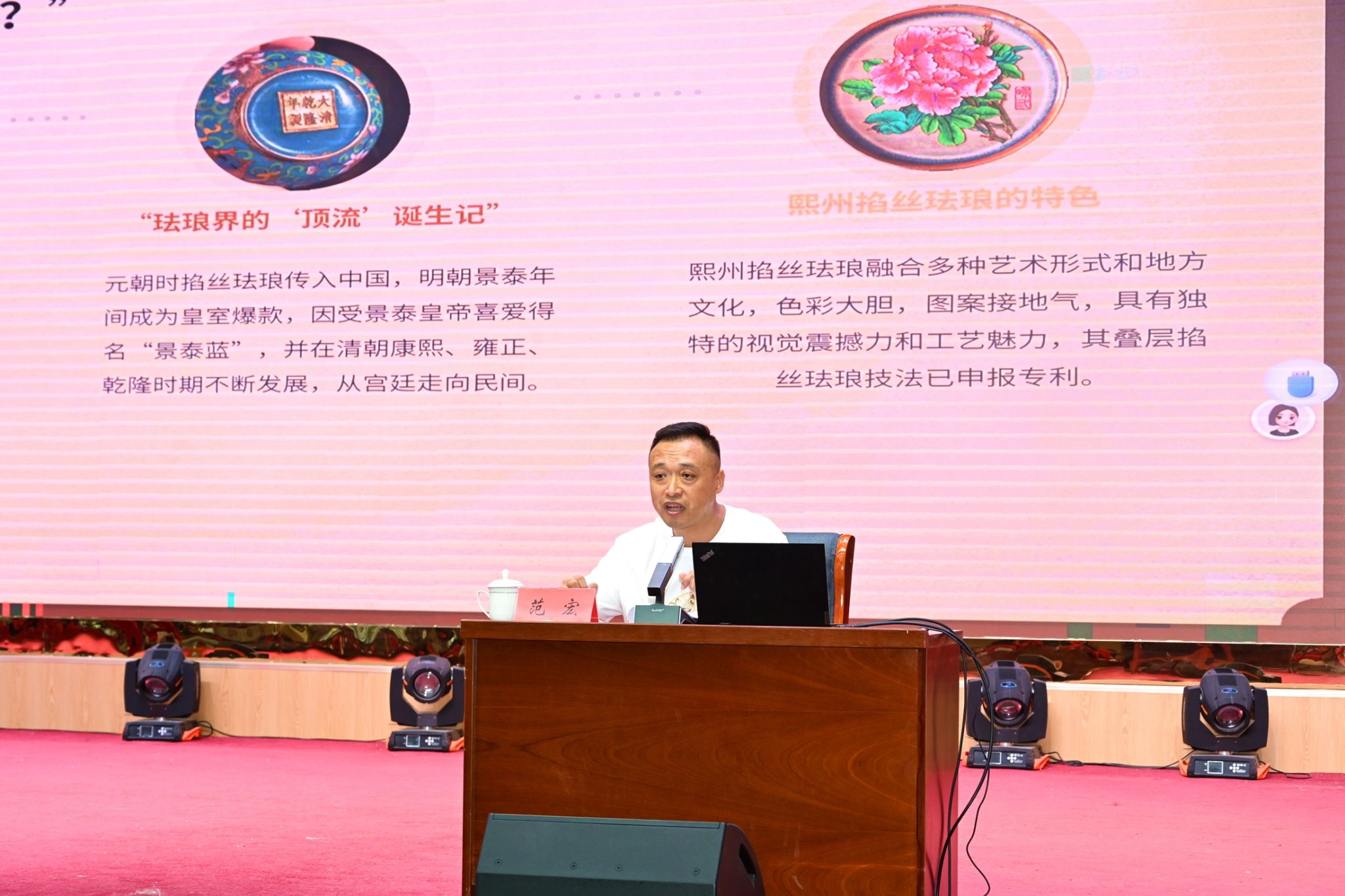 宣讲环节,范宏老师以饱满的热情和生动的语言,分享了掐丝珐琅这一古老工艺的精妙之处,以及其在传承中面临的挑战与机遇。他将对技艺的极致追求融入日常生活与工作的点滴故事,深刻诠释了“干一行、爱一行、精一行”的工匠精神内核,令在场师生深受触动。